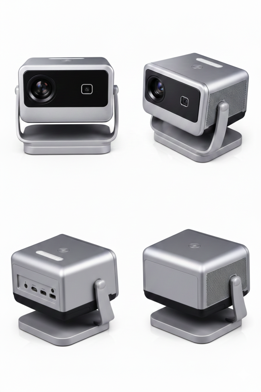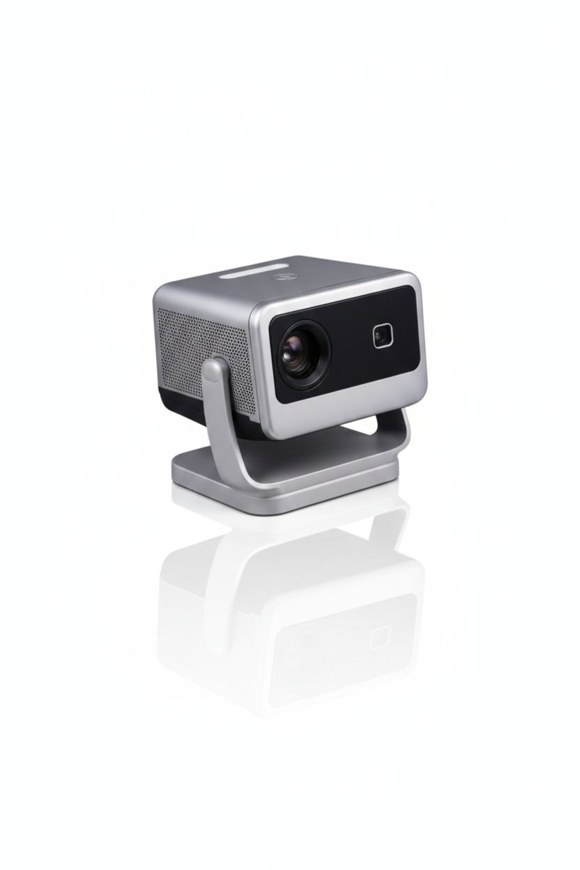 A sleek Ultra HD smart mini projector featuring autofocus technology, AI image optimization, and a modern adjustable stand. Perfect for home cinema, presentations, gaming, and portable entertainment.